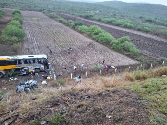 | Dijo que el autobús, que se dirigía a la región de la Huasteca Potosina, impactó al vehículo, lo que provocó que el chofer del camión perdiera el control de la unidad y volcara.