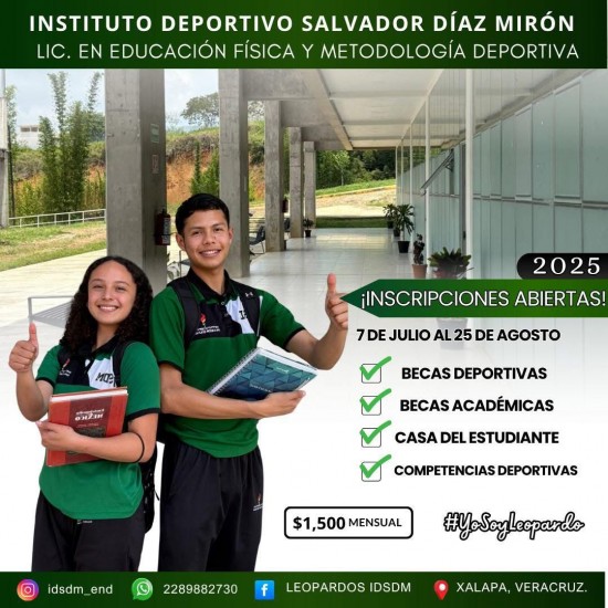 Requisitos: ✅ Acta de nacimiento actualizada original y copia. ✅ Certificado de terminación de estudios de bachillerato legalizado, en caso de aún no contar con el, constancia de estudios emitida por la institución de procedencia. ✅ Certificado médico reciente. ✅ CURP original y copia. ✅ Seis fotografías recientes, tamaño infantil. ✅ Pago de arancel. ✅ Constancia de antecedentes no penales. Para mayores informes puedes acudir directamente a las instalaciones deportivas ubicadas en Av. Gaspar Yanga S/N Fraccionamiento las Fuentes, Xalapa, Veracruz O comunicarte a los siguientes números telefónicos: 📞 228 504 4135 💬 228 988 2730 ¡El Instituto Deportivo Salvador Díaz Mirón tiene un lugar para ti |