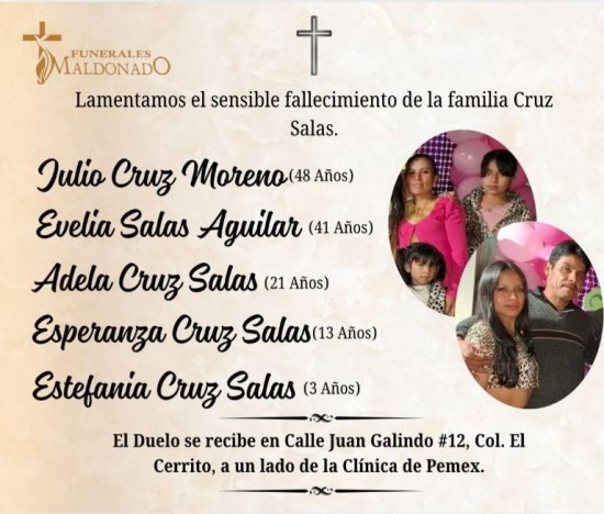 Los hechos ocurrieron en la colonia Nuevo Monterrey del municipio de Huauchinango y las víctimas fueron identificadas como Julio Cruz Moreno, de 40 años; Evelia Salas Aguilar, de 41; y sus tres hijas: Adela Cruz Salas, de 21 años; Esperanza Cruz Salas, de 13; y Estefanía Cruz Salas, de tan solo 3 años.