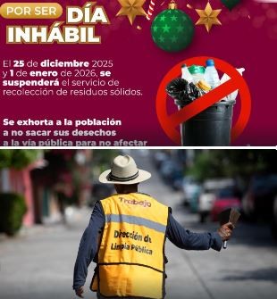 Para no afectar la imagen urbana y prevenir problemas de salud pública, se exhorta a la población a no sacar los desechos a las calles. El servicio se reanudará con sus rutas y horarios habituales el 26 de diciembre y 2 de enero.