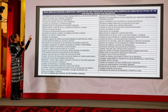 Contrastó los 206 mil pesos de salario neto que percibían los togados anteriores contra 134 mil en la actualidad; subrayó la desaparición del pago de riesgo por 639 mil pesos y la cancelación del seguro de separación individualizada, por 523 mil. Sin mediar pregunta, la mandataria difundió información que proporcionó el Órgano Administrativo del PJF a la Secretaría de Gobernación, según la cual el aguinaldo de los ministros se redujo de 585 mil a 376 mil pesos y se cancelaron los 36 mil 906 pesos mensuales del seguro de gastos médicos mayores por ministro, el apoyo para alimentos por 5 millones 341 mil y otra partida de un millón 337 mil para gastos de telefonía celular, entre otros. En la mañanera, Sheinbaum difundió el reporte del Órgano Administrativo del PJF en el que se destaca que en el área de ministros se suprimieron 59 ayudas para trámites de carácter no oficial, de 149 que existían, y los otros 90 se encuentran bajo análisis para determinar su procedencia. Entre los 59 trámites cancelados sobresalen: contratación de suministro de agua, energía eléctrica y servicios de telefonía para sus viviendas; apoyo para reparación de refrigeradores; compra de enseres menores, como despensa; adquisición de camisetas y bordado de ropa; mantenimiento de elevadores, plantas de luz y reparación eléctrica o de gas en domicilio particular; solicitud de pipas de agua; compra de alimentos tipo servicio a domicilio y apartado de lugares y gestión en estadios de futbol y beisbol. Otras prestaciones eran traer objetos exclusivos de otros países; asignar personal para el cuidado de menores de edad; proporción de vehículos oficiales para festejos en eventos particulares; uso del personal para actividades de limpieza, mudanzas, carga de cajas, bultos, macetas y artículos en domicilio particular; préstamos vehiculares a familiares y traslado de parientes a consultas médicas. Además: poda, derrama y limpieza, alcantarillado, drenaje, alumbrado; gestión de boletos de cortesías; servicio de OCESA y Ticketmaster; monitoreo de paquetería en envíos realizados por empresas especializadas; trámites bancarios; apoyo hospitalario; recuperación de objetos; compra de regalos y boletos de avión; reservación de hospedaje; mantenimiento de jardín; adquisición de flores y coronas para fines funerarios; inscripción en escuelas, pago de colegiaturas y obtención de becas; solicitud de ingreso a México de extranjeros y servicio de meseros y servicio de valet parking. |