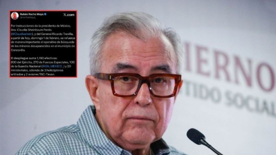 | Refuerzan con mil 190 elementos búsqueda de mineros desaparecidos en Concordia: Rocha. | ||||||