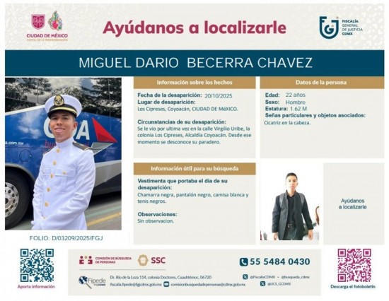 “Hasta ahora no tenemos información clara que nos permita saber qué pasó con Miguel Darío; seguimos esperando datos concretos”, señaló Miguel Becerra, padre del cadete. Durante el pasado fin de semana, las labores se concentraron en las inmediaciones del municipio de Aldama, zona donde presuntamente se tuvo el último rastro del joven, de acuerdo con la información obtenida del celular del cadete y que recabaron las autoridades ministeriales. En los operativos participaron elementos de la Secretaría de Marina, la Guardia Estatal y personal de la Fiscalía General de Justicia del Estado, sin que hasta el momento se hayan obtenido resultados positivos. Los familiares entregaron una carta a la Fiscal General de la República, Ernestina Godoy Ramos, para solicitar que la Federación atraiga el caso y se sume de manera directa a las labores de búsqueda, con el objetivo de ampliar las líneas de investigación y acceder a mayores capacidades técnicas y de inteligencia. “Nuestra petición es que la Federación se sume de manera directa a la búsqueda, porque cualquier herramienta adicional puede marcar la diferencia para encontrarlo”, expresó. Miguel Becerra, padre del cadete y quien la semana pasada encabezó una protesta que incluyó el bloqueo de la Avenida de la Industria, señaló que, pese al despliegue de las corporaciones, no existe información concreta que permita esclarecer qué ocurrió con su hijo. La falta de avances, sostuvo, mantiene a la familia en una prolongada incertidumbre. El padre de Miguel Darío explicó que aún se espera información considerada clave para el caso, como posibles movimientos bancarios, registros de empresas de autotransporte que permitan determinar si el cadete abordó alguna unidad, así como el uso de herramientas tecnológicas que contribuyan a su localización. De acuerdo con la familia, fue el 20 de octubre de 2025 cuando cámaras de videovigilancia de la central de autobuses de Tampico captaron por última vez al joven. A partir del 21 de octubre se perdió todo contacto con él, sin que hasta ahora exista rastro alguno. |