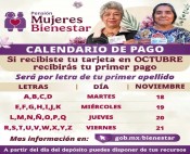 Del 18 al 21 de noviembre inicia pago a nuevas beneficiarias de la Pensión Mujeres Bienestar 60-64 MEMORANDUM 26.- A partir de este martes 18 de noviembre, el Gobierno Federal iniciará el depósito de pagos de pensiones del programa Mujeres Bienestar de 60 a 64 años, de acuerdo con una calendarización por índice alfabético. Este martes las mujeres inscritas al programa y cuyo primer apellido inicie con las letras A, B, C y D recibirán el pago de 3 mil pesos bimestrales en la tarjeta del Banco Bienestar. El miércoles 19 llegará el depósito directo a quienes sus apellidos que comiencen con las letras E, F, G, H, I, J y K. El jueves 20 será para L, M, N, Ñ, O, P y Q, y por último el viernes 21 de noviembre, el apoyo estará disponible para quienes el resto de las letras: R, S, T, U, V, W, X, Y y Z. Las beneficiarias serán quienes se hayan inscrito, en agosto pasado, al programa federal y ya hayan recibido las tarjetas en octubre. De acuerdo con la Secretaría del Bienestar, la Pensión Mujeres Bienestar tiene un registro total de 2 millones 982 mil 222 beneficiaras de entre 60 y 64 años de edad y se destinarán 8 mil 445 millones de pesos para el periodo noviembre-diciembre.