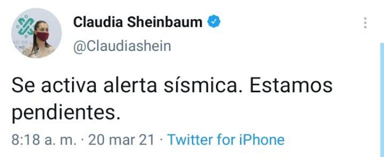 La jefa de gobierno Claudia Sheinbaum lanzó un tuit advirtiendo la activación del sistema de alerta y pidiendo a la población estar alerta ante el posible movimiento telúrico. Los capitalinos salieron de inmediato a las calles, para salvaguardarse, por lo que fue posible ver escenas de pánico entre algunas personas que se despertaron con la activación de la Alerta Sísmica.