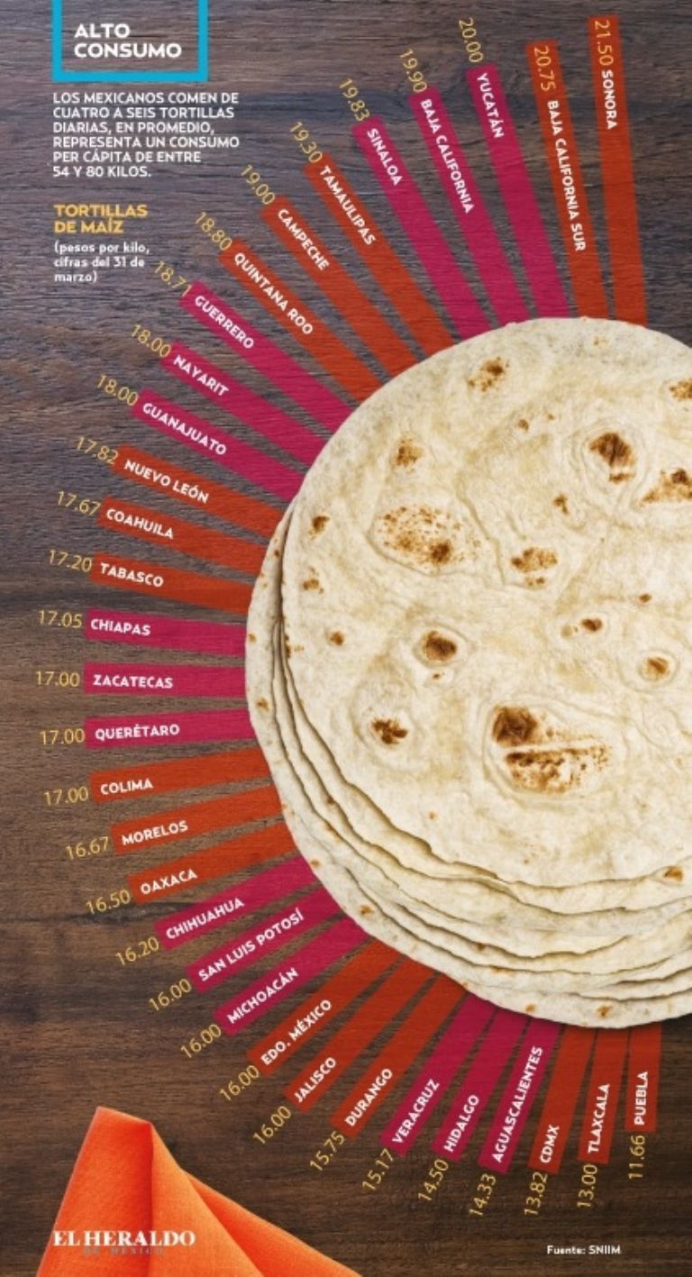 A nivel nacional, en marzo, la tortilla registró un aumento anual de 6.15 por ciento, el mayor en 39 meses y una cifra superior a la inflación nacional (4.67 por ciento). De acuerdo con el Sistema Nacional de Información e Integración de Mercados, en los últimos tres meses, el kilo de tortilla a nivel nacional pasó de 15.55 por kilo en enero a 16.18 pesos en abril. “Parecen pocos centavos, pero el aumento se resiente mucho porque las tortillas son la base de la alimentación de los mexicanos; se almuerza, come y cena con ellas”, dijo Cuauhtémoc Rivera, presidente de la Alianza Nacional de Pequeños Comerciantes (Anpec). Según el Consejo Nacional de Evaluación de la Política de Desarrollo Social (Coneval), el consumo per cápita de tortilla es en promedio de 75 kilos al año, esto es, entre 7 y 10 tortillas diarias. De acuerdo con Héctor Magaña, analista del Tec de Monterrey, el aumento obedece al incremento de dos insumos básicos en su elaboración, el maíz y el gas. ![]() Gabriela Siller, economista en jefe de Banco Base, destacó que el maíz tocó el viernes un precio máximo de 5.95 dólares por bushel, nivel no visto desde el 12 de julio de 2013. En lo que va del año, el precio internacional del maíz se ha encarecido 19 por ciento, y alcanzó su nivel más alto de los últimos nueve años, mientras que en el acumulado de los últimos 12 meses es de 71 por ciento. “El aumento en los commodities, principalmente en granos como maíz y la soya, están impactando el precio de la canasta básica. Hay un componente en la parte alimentaria que está presionando la inflación y es uno de los rubros que más incide sobre ésta”, comentó José Luis de la Cruz. De la Cruz explicó que México no es autosuficiente en producción de maíz, esto hace que el impacto en el precio de los productos a base de este grano registre alzas significativas. “La evolución de los precios internacionales y las materias primas va a continuar porque el proceso de reactivación económica en algunas economías como China y Estados Unidos va a causar que siga el incremento en precios, pero para el tercer o cuarto trimestre podríamos ver una estabilización”, destacó de la Cruz. Tan sólo en el primer bimestre del año las importaciones de maíz al país aumentaron 5.2 por ciento en su volumen, pero el aumento en su valor fue de 41.6 por ciento. Aunado a ello, en marzo, el gas doméstico tuvo un aumento anual de 33 por ciento. “Esto va a seguir presionando la inflación de México al alza”, señaló Siller. El mayor incremento en la tortilla se registró en Tamaulipas, con una elevación de 10.9 por ciento. Datos del Inegi revelan que, de manera estatal, el mayor incremento en la tortilla se registró en Tamaulipas, con un incremento de 10.9 por ciento. En tanto, en la capital del país, Jalisco, Baja California, Chiapas, Tlaxcala, Zacatecas, Michoacán e Hidalgo el alza fue de entre 8.1 a 9.5 por ciento. Por precio, Sonora registró el mayor nivel el 31 de marzo, con 21.50 pesos por kilo; seguido de Baja California Sur (20.75 pesos); Yucatán (20 pesos), Baja California 19.90 (pesos), Sinaloa (19.83 pesos). |
