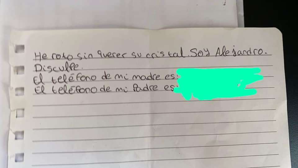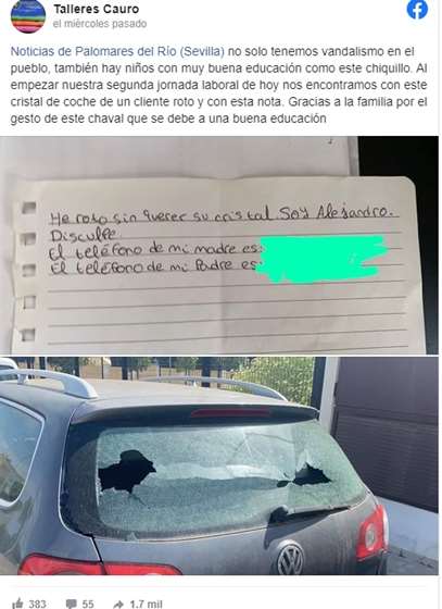 El caso lo dio a conocer Talleres Cauro, local automotriz donde se encontraba el automóvil afectado. "No sólo tenemos vandalismo en el pueblo, también hay niños con muy buena educación como este chiquillo", escribió el negocio en su cuenta de Facebook. ![]() "Al empezar nuestra segunda jornada laboral de hoy nos encontramos con este cristal de coche de un cliente roto y con esta nota". "Gracias a la familia por el gesto de este chaval, que se debe a una buena educación", agregó. Tras publicar el mensaje, éste de inmediato se volvió viral; al momento ha sido compartido en casi 2 mil ocasiones y ha recibido decenas de comentarios de otros internautas. "Alejandro, sigue así fenómeno. Los errores se asumen con humildad, se responde ante ellos y seguimos para delante", "Si fuese el dueño del coche, llamaría a los padres para felicitarles por la educación que le dieron a su hijo" y "Hay hogares en nuestro país donde se sigue educando en valores", fueron algunos señalamientos de otros usuario de