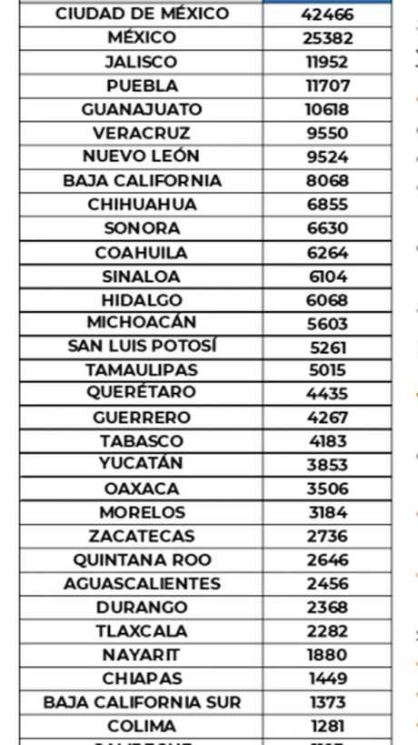 Desde Palacio Nacional, señaló que la Ciudad de México y el Estado de México son las entidades con mayor número de casos activos estimados (con fecha de inicio de los últimos 14 días por el índice de positividad, por entidad y semana epidemiológica). A nivel nacional se calculan 19,239 contagios de este tipo. Además, hay cientos de defunciones sospechosas que podrían sumarse al total en las próximas horas. También contabilizaron pacientes 1,897,587 recuperados y, por otro lado, se registran 10,108,593 personas con esquema completo de vacunación. Las 10 primeras entidades que acumulan el mayor número de casos son: Ciudad de México, Estado de México, Guanajuato, Nuevo León, Jalisco, Puebla, Sonora, Querétaro, Coahuila y Tabasco, que en conjunto conforman más de dos tercios (67%) de todos los casos acumulados registrados en el país. ![]() La Ciudad de México registra la mayor parte de los casos acumulados del país y representa por si sola 27% de todos los casos registrados por entidad de residencia. La distribución por sexo en los casos confirmados muestra un igual predomino tanto en mujeres como en hombres (50%). La mediana de edad en general es de 42 años. La distribución por sexo en las defunciones confirmadas muestra un predomino del 62% en hombres. La mediana de edad en los decesos es de 64 años. El siguiente gráfico muestra la distribución de defunciones confirmadas y sospechosas por fecha de defunción. La tabla describe el número de defunciones positivas a COVID-19 por fecha de defunción al corte del día de hoy, ordenadas de mayor a menor según la entidad federativa. La Ciudad de México, el Estado de México, Jalisco, Puebla, Guanajuato, Veracruz, Nuevo León, Baja California, Chihuahua y Sonora se ubican como las 10 entidades que han registrado el mayor número de defunciones y que en conjunto representan más de la mitad (64.8%) de todas las del país. La Ciudad de México por sí sola, acumula 19.3% de todas defunciones a nivel nacional. Conforme a lo referido por el funcionario, hasta este viernes hay un -84% de reducción de ocupación de camas a nivel nacional (tanto de atención general y con ventilador) desde el último pico de casos. Respecto a las camas de hospitalización general, detalló que hay un 10% de espacios ocupados en el país y los de ventilación mecánica, dedicados a los pacientes graves de COVID-19, tienen una ocupación del 14 por ciento. Avance de vacunación Hasta el jueves 13 de mayo, día de corte informativo, se inyectaron 451,764 dosis del antígeno contra el virus SARS-CoV-2. En suma, se han aplicado 22,413,285 vacunas hasta este día. Del total, 14,996,844 han sido dosis para personal de la salud, adultos mayores de 50 años y profesores. Además, 1,081,983 han sido para trabajadores de la salud. Respecto al personal educativo, en las diversas entidades del país se han aplicado 1,648,248; de las personas adultas mayores con 60 y más años se han inyectado 10,709,567 antígenos; finalmente se han aplicado 1,557,046 vacunas a personas de 50 a 59 años. De acuerdo con las autoridades sanitarias este día se liberaron 202,700 dosis de la vacuna Covidecia de CanSino Biologics. Con ello se concluye la entrega de vacunas de esta semana que cerró en un total de 1,420,380 de Pfizer-BioNtech y 614,210 de la farmacéutica china que en conjunto son 2,034,590 dosis contra COVID-19. México ha recibido 29 millones 128 mil 275 dosis de vacunas de las farmacéuticas: Pfizer-BioNTech, AstraZeneca, Sinovac, Centro Nacional de Investigación de Epidemiología y Microbiología Gamaleya, así como CanSino Biologics, incluidas las envasadas en México en el laboratorio Drugmex del fármaco chino. Telemedicina Este día las autoridades sanitarias señalaron que la telemedicina ayuda al acompañamiento a distancia en el tratamiento de pacientes, en el apoyo para el desarrollo organizacional y la planeación ante desastres. Por otro lado, señalaron que a más de un año del primer caso registrado en el país, los especialistas continúan entrenándose en el manejo clínico contra COVID-19 a través de CovidUTI, en donde se llevan a cabo foros virtuales en vivo de micrófono abierto, cursos de manejo de pacientes graves y hay recursos bibliográficos interinstitucionales e internacionales. Cabe recordar que la ciudadanía tiene cuatro medios para mantenerse informados sobre la vacunación y cualquier otro tema relacionado al COVID-19, son: - El sitio: vacunacovid.gob.mx - Al email: buzon.covid@salud.gob.mx - Al número: 55-3684-0370 - Con los asistentes virtuales de mensajería Las autoridades exhortan a la ciudadanía a usar cubrebocas, lavarse continuamente las manos o usar gel antibacterial y mantener sana distancia sin importar que ya estén vacunados o el color del semáforo en el que se encuentre su entidad. |