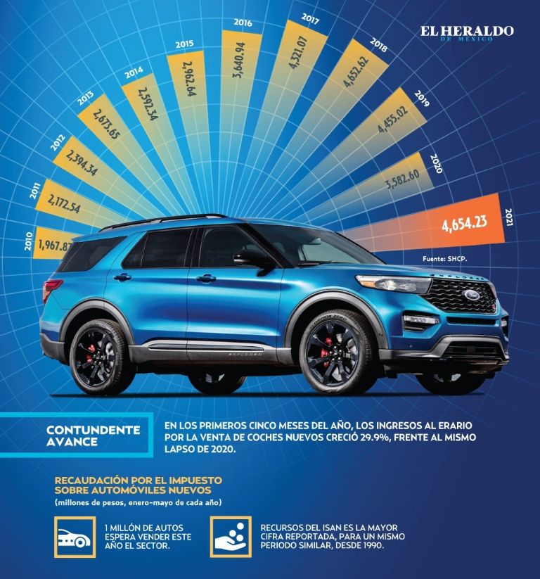 mismo periodo de 2020, de acuerdo con la Secretaría de Hacienda y Crédito Público. Los recursos que ingresaron a las arcas, en los primeros cinco meses, ascendieron a cuatro mil 654 millones de pesos, superior a tres mil 583 millones de pesos, del mismo periodo de un año antes, lapso que se afectó por la pandemia, principalmente en abril y mayo. Guillermo Rosales, director general adjunto de la Asociación Mexicana de Distribuidores de Automotores (AMDA), señaló que esta tendencia de crecimiento puede detenerse totalmente, una vez que el gobierno permita la importación de automóviles ilegales, provenientes de EU. “El presidente (Andrés Manuel López Obrador) ya abrió la puerta de que sea una regulación nacional. Esto tendría un impacto en la industria automotriz, en la comercialización de vehículos nuevos, en consecuencia en los recursos para sus programas o inversión productiva que tanto necesita el país”, añadió el director general adjunto de la AMDA, en entrevista con El Heraldo de México. Según la base de datos de la Secretaría de Hacienda, los ingresos del erario por concepto del Impuesto Sobre Automóviles Nuevos (ISAN), obtenidos en los primeros cinco meses de 2021, es la mayor cifra reportada para un mismo periodo, similar desde que hay registro a partir de 1990. Los recursos representan cerca de una tercera parte de lo que el gobierno federal invierte en la conservación de carreteras libres de cuota en el país. El ejecutivo señaló que cuando Vicente Fox en su sexenio autorizó la entrada de vehículos chocolate, las ventas de autos nuevos disminuyeron 40 por ciento en los tres primeros años.