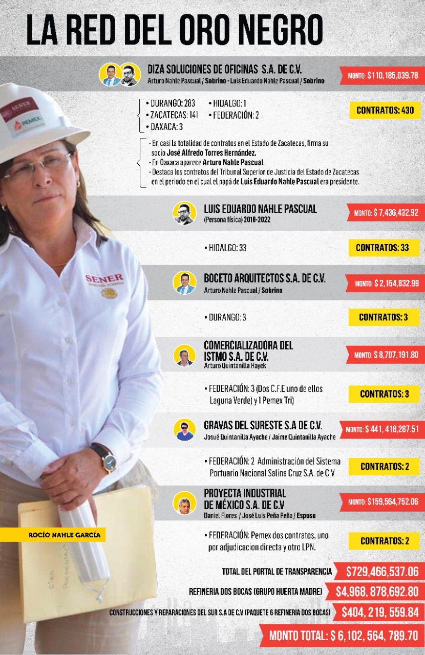 La red de negocios familiares cercanos a la secretaria de energía Rocío Nahle García, creció mil 958 por ciento en tres años, al sumar hasta el momento casi 730 millones de pesos, resultado de al menos 430 contratos con la Federación y Estados con presencia de Pemex y CFE, revelan documentos oficiales. Antes de la llegada de Rocío Nahle a la titularidad de la Secretaría de Energía, la empresa de sus sobrinos sólo mantenía operaciones en el estado de Durango, con un monto máximo de facturaciones de 3 millones 684 mil 783.52 pesos desde su constitución el 14 de diciembre de 2016. Cuando se terminen de entregar los documentos solicitados por la plataforma Nacional de Transparencia, la cifra se podría elevar a más de mil 200 millones de pesos. La empresa Diza Soluciones de Oficina S.A de C.V, cuyos propietarios y accionistas son Arturo Nahle Pascual, además de José Alfredo Torres Hernández y cuyo representante legal es Luis Eduardo Nahle Pascual, es la principal firma operadora de los negocios de la Familia Nahle. Dentro de la red se logró identificar además a las personas morales Gravas del Sureste S.A de C.V, Proyecta Industrial de México, Comercializadora del Istmo S.A de C.V y Boceto Arquitectos S.A de C.V. En algunos contratos aparecen los familiares de Rocío Nahle como propietarios y firmando los contratos, mientras que en otras ocasiones figuran los representantes legales en lo que parece un intento de esconder las operaciones Dicha empresa, que en el año 2020 recibió contratos por 35 millones de pesos por servicio de fotocopias en Oaxaca, siguió operando con normalidad a pesar de las denuncias de nepotismo. Lleva hasta el momento facturado $110 millones 185 mil 39.78 pesos en distintos rubros, principalmente fotocopias, artículos de papelería y suministros informáticos. Según reportes de la Secretaría de Hacienda y Crédito Público (SHCP), la firma de la familia Nahle tuvo un crecimiento espectacular, al pasar de la cifra anterior a $54 millones 949 mil 164.46 pesos en el ejercicio fiscal 2020 y para el 2021, la firma obtuvo contratos por otros $20 millones 904 mil 739.46 pesos. Como antecedente y prueba de los manejos a los que este grupo está acostumbrado a trabajar, existe el caso de la asignación de contratos por parte del Tribunal Superior de Justicia del Estado de Zacatecas, en el que el hermano de la titular de la Sener, Arturo Nahle García, asignó contratos por 10 millones 268 mil 840.91 pesos entre el 2018 y 2021, a la empresa Diza Soluciones de Oficina S.A de C.V, cuyo propietario es su hijo. Los contratos en esta serie de operaciones no fueron firmados por Arthuro Nahle Pascual, en su lugar fue José Alfredo Torres Hernández el que signó los documentos, para al menos en los papeles y la apariencia, no entrar en un conflicto de interés. Desde la llegada de Nahle García al cargo, esta empresa, de forma coincidente, inició y expandió sus operaciones en los estados de Hidalgo, Oaxaca y Zacatecas, donde existe presencia de la paraestatal Petróleos Mexicanos (Pemex) y de la Comisión Federal de Electricidad (CFE), ambas dependientes directas de la Secretaría de Energía. ![]() GRAVAS DEL SURESTE, OTROS SOBRINOS DEL COMPADRE El grupo empresarial cercano a Nahle García también logró obtener contratos en lo que va de este sexenio por $441 millones 418 mil 287.51 pesos, utilizando a los hermanos de su compadre Arturo Quintanilla Hayek. En esta serie de operaciones la contratista, otra vez en un estado con presencia de alguna paraestatal dependiente de Sener, fue el Sistema Portuario Nacional de Salina Cruz S.A de C.V. El recinto portuario contrató en 2018 a la empresa para reparación de daños ocasionados a la infraestructura del muelle por el sismo del año anterior, en 2017, es decir ocho meses más tarde y le asignó un monto a las reparaciones de 87 millones de pesos, IVA incluido. El otro contrato asignado a Gravas del Sureste fue firmado el 22 de diciembre del año 2021 por un monto con impuesto incluido de $354 millones 418 mil 287.51 pesos, por el concepto de reforzamiento de muelles en el puerto comercial de Salina Cruz también en Oaxaca. Gravas del Sureste fue creada el 9 de febrero de 1996, ante la fe de los notarios Olga Rebeca López Nassar, Yohan Hillman Chapoy y Jesús Salas Lizaur, con un capital social de 1 millón de pesos. Su representante es Enrique Quintanilla Hayek (hermano del compadre de la secretaria de energía) y entre sus socios se encuentran Luz del Alba Gallegos Pérez, Oscar González Alemán. Dentro de la organización de Gravas del Sureste, uno de sus socios también es la empresa Delta Administración S.A. de C.V., integrada por Jorge Hayek Domínguez, sobrino del compadre de la familia Peña Nahle. En el directorio aparecen Jaime Quintanilla Garza, también sobrino; Sami Hayek Domínguez, papá de la actriz Salma Hayek; José Antonio Vélez Martínez, Eduardo Ramírez Peredo. Gravas del Sureste, antes del inicio de esta administración federal, no presenta contratos o apariciones en los padrones de proveedor dentro del sistema de administraciones portuarias de México (APIS). Tampoco se pudo constatar su experiencia como empresa reparadora de daños en los sistemas portuarios mexicanos. TODOS LOS CONTRATOS DE SOBRINOS SUMAN El sobrino de la titular de Sener, Luis Eduardo Nahle Pascual, además de ser representante y socio de Diza Soluciones de Oficina S.A de C.V, ha facturado como persona física en el estado de Hidalgo con 33 contratos desde 2018 a junio de 2022 un total de 7 millones 436 mil 432.92 pesos, que se suman a la actividad directa de la Familia Nahle. EL OTRO COMPADRE DE DOS BOCAS Y SUS 4 MIL 600 MDP “EXTRA” Lo mismo ocurre con Construcciones y Reparaciones del Sur, de Juan Carlos Fong, con sede en Coatzacoalcos, Veracruz, que forma parte de consorcio Huerta Madre creado tres días antes de entregarles ganar un contrato por 4 mil 968 millones de pesos en Dos Bocas. Posterior a esto, F