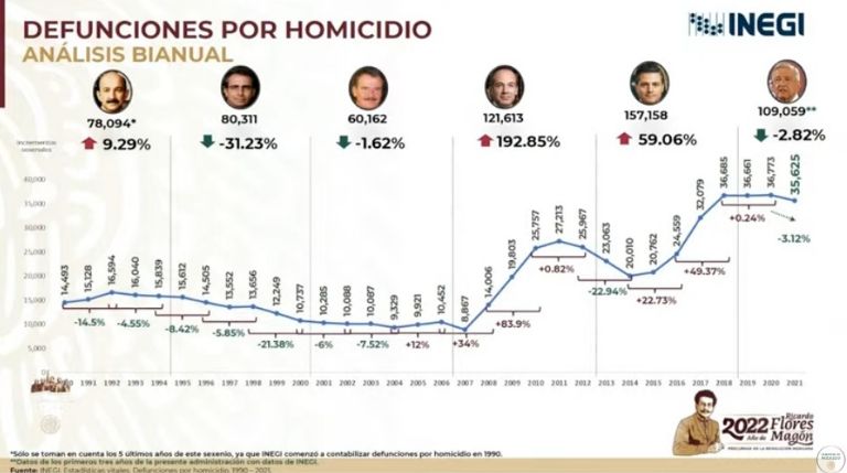Los datos del INEGI fueron adelantados por la secretaria de Seguridad y Protección Ciudadana, Rosa Icela Rodríguez Velázquez, durante la conferencia mañanera de este martes en Palacio Nacional. Dijo que en 2019 y 2020 “se había estado conteniendo el homicidio y ya se ve en el 2021 una baja considerable de mil 148 homicidios menos”. “Hoy se darán a conocer por parte del Instituto Nacional de Estadística y Geografía (INEGI), los datos preliminares que revelan una disminución de homicidios en México, lo que consideramos es que la estrategia nacional de seguridad está dando resultados”, dijo. En 2018, último año del sexenio de Peña Nieto, se registraron 36 mil 685 homicidios; en 2019, primer año de la actual administración de López Obrador, hubo 36 mil 661; en 2020, 36 mil 773; y en 2021, 35 mil 625. “Las estadísticas del INEGI revelan que de enero a diciembre de 2021 se registraron mil 148 homicidios menos, con respecto al 2020. Lo que consideramos, como gabinete de seguridad nacional, un avance importante que refleja el resultado del esfuerzo diario”, dijo. ![]() La secretaria agradeció el trabajo de los gobiernos de los estados y de los municipios que participan diariamente en las mesas de construcción de paz y seguridad, las mesas de paz estatales y regionales. “También agradecer el trabajo de la Secretaría de la Defensa, de la Secretaría de la Marina, de la Guardia Nacional, del Centro Nacional de Inteligencia, como los elementos de la Secretaría de Seguridad y Protección Ciudadana”, concluyó. |
