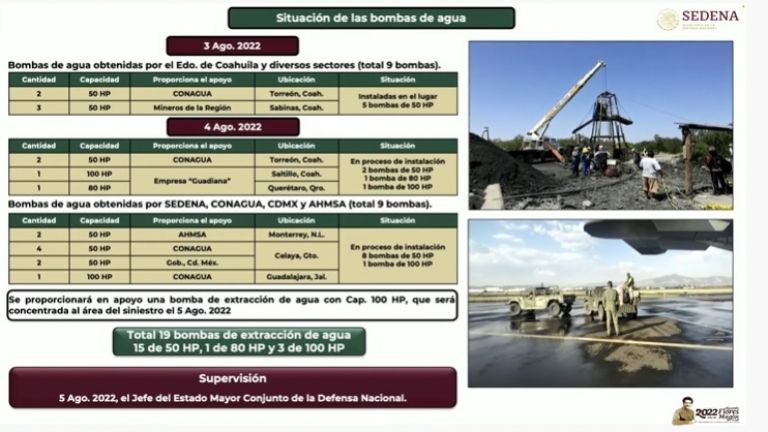 “Mandarle nuestra solidaridad, nuestro abrazo a los familiares y que no perdamos la fe”, dijo en la conferencia mañanera. El derrumbe en la mina denominada Conchas Norte, en el municipio de Sabinas, sucedió el pasado miércoles, a las 13:35 horas. Laura Velázquez Alzúa, coordinadora nacional de Protección Civil, dijo que el equipo de rescate desplegado ha logrado disminuir los niveles de agua en 30 metros, a partir del accidente. “Resulta indispensable reducir el nivel de espejo de agua en la zona del incidente para estar en condiciones de permitir el ingreso seguro al personal especializado en búsqueda y rescate”, dijo. En la zona hay desplegados 383 elementos de rescate, y con 19 bombas sumergidas se trabaja para reducir los niveles de agua. De los equipos de bombeo nueve son de Conagua, cinco de compañías mineras y dos provenientes de la Ciudad de México. También mantienen 11 generadores eléctricos, ocho torres de iluminación y 60 vehículos terrestres. ![]() Agustín Radilla Suástegui, subsecretario de la Defensa Nacional, explicó que seis buzos de fuerzas especiales permanecen en espera de que descienda el nivel de agua para iniciar sus actividades. También hay 30 elementos de Respuesta Inmediata a Emergencias y Desastres que evalúan el área para iniciar actividades de búsqueda y rescate. “Este organismo especializado cuenta con capacidades para la búsqueda y rescate de personas atrapadas en estructuras colapsadas, empleando equipo especial para romper concreto y metal, y cuenta con detectores de calor a través de paredes y binomios canónicos. Ellos ya efectuaron los reconocimientos necesarios, de tal forma que una vez que baje el nivel del agua podrán entrar en acción para lograr el rescate de los 10 mineros atrapados”, explicó. |