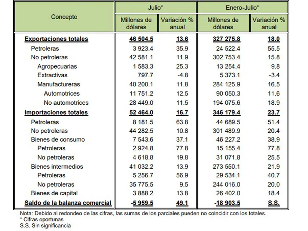 | Balanza comercial de México registró un déficit de 18 mil 904 mdd en los primeros siete meses de 2022. | ||||||
