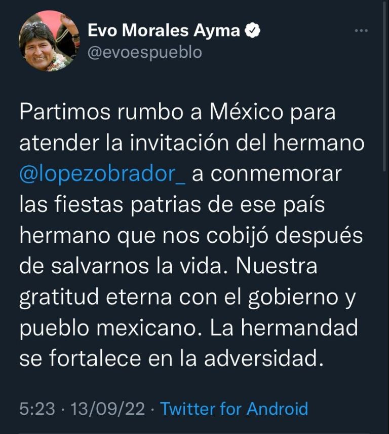 | Evo Morales ya viaja a México para dar el Grito con AMLO: "La hermandad se fortalece". | ||||||
