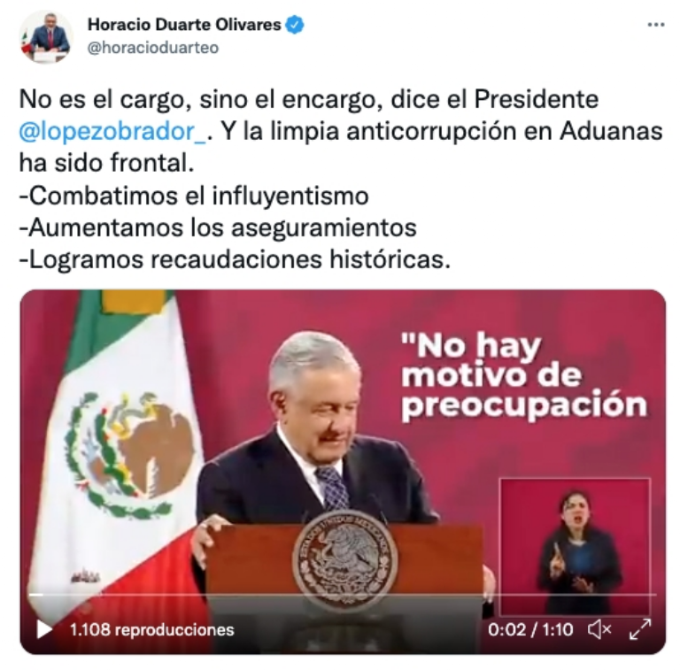 El presidente Andrés Manuel López Obrador dijo que Duarte Olivares ahora cumplirá con una “tarea” en el Estado de México, además de que "no se podía ir por la puerta de atrás". No aclaró si se suma al equipo de Delfina Gómez. Es la segunda renuncia que anuncia López Obrador en menos de una semana. El presidente incluso ironizó con un abrazo cuando se despidió de Horacio Duarte, en clara referencia a la renuncia de Tatiana Clouthier como secretaria de Economía. “Horacio me ha entregado su renuncia y no queríamos que se fuera por la puerta de atrás, igual que Tatiana (Clouthier) que nos ha ayudado tanto para triunfar, en este caso va a una tarea a su estado natal, el Estado de México, no podríamos hablar más de eso porque no nos corresponde”, expresó López Obrador. El jefe del Ejecutivo Federal alzó su brazo y expresó: “No te voy a abrazar”. -“Voy a dar la batalla”, dijo el mexiquense. El primer mandatario dijo que este jueves informará quién estará al frente de Aduanas. Este miércoles, el aún titular de la Agencia Nacional de Aduanas de México (ANAM) presentó un informe sobre el trabajo con decomisos en armas, drogas y recaudación. Estuvo acompañado por los titulares de Sedena, Marina, y Segob. Sobre el informe final de Horacio Duarte El titular saliente de Aduanas informó que tras las labores de seguridad nacional e inteligencia en las aduanas, lograron el decomiso de 43.6 toneladas de drogas y han asegurado 97.9 por ciento más armas cortas que en el sexenio de Felipe Calderón y 106 por ciento más que en el de Enrique Peña Nieto. Además, indicó que en el combate contra la corrupción, más 3 mil funcionaros de adunaas han sido dados de baja. Destacó que de enero a septiembre de 2022, se han recaudado 820 mil millones de pesos, y estiman tener un ingreso de más de 1 billón de pesos para las arcas públicas. Destacó que la alta recaudación se debe en parte a las labores de vigilancia y administración que han realizado las Fuerzas Armadas en las 50 aduanas que hay en el país. Duarte Olivares afirmó que además de que se tuvo un incremento de 8 por ciento en la recaudación de las aduanas; 6 mil 960 efectivos de Sedena y Semar están desplegados en las aduanas, y para fin de año se sumarán 2 mil 297 elementos de las Fuerzas Armadas. Horacio Duarte y su enigmático mensaje en las redes En su última publicación aún al frente de Aduanas, en su cuenta de Twitter, Horacio Duarte resaltó la importancia de llevar a cabo la limpia contra la corrupción, y dejó entrever que tienen mayor peso las acciones que los cargos, como un preludio a su renuncia como funcionario federal. “No es el cargo, sino el encargo, dice el Presidente @lopezobrador_ . Y la limpia anticorrupción en Aduanas ha sido frontal. -Combatimos el influyentismo -Aumentamos los aseguramientos -Logramos recaudaciones históricas”. ![]() La Agencia Nacional de Aduanas de México se creó como órgano administrativo desconcentrado de la Secretaría de Hacienda y Crédito Público (SHCP) el 14 de julio de 2021. De acuerdo con el Gobierno de México, la agencia tiene como objetivo: "Continuar fortaleciendo el combate al contrabando, la introducción de drogas y la corrupción, la Administración General de Aduanas se desincorpora del Servicio de Administración Tributaria (SAT) para crear la Agencia Nacional de Aduanas de México (ANAM) como un órgano administrativo desconcentrado de la Secretaría de Hacienda y Crédito Público". El dectreto fue publicado en el Diario Oficial de la Federación (DOF), con el cual se instruye la creación de la Agencia Nacional de Aduanas de México para sustituir a la Administración General de Aduanas (AGA). De acuerdo con el artículo séptimo transitorio se definió que Horacio Duarte Olivares, actual administrador general de Aduanas, quedó como el titular de la ANAM. |