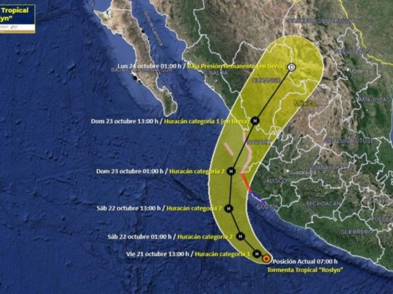 En conferencia de prensa para detallar la trayectoria y avance de la tormenta tropical en el Océano Pacífico, Méndez Girón dijo que en las próximas horas Roslyn se convertirá en huracán categoría 1. “Continuará desplazándose hacia el oeste noroeste y se espera que durante el transcurso de la tarde y noche de hoy se intensifique a huracán categoría 1 con vientos de 119 a 153 kilómetros por hora”. La directora del SMN indicó que durante el sábado Roslyn se convertirá en huracán categoría 2, antes de golpear las costas de Jalisco y Nayarit por la noche. Roslyn avanza frente a las costas de Colima Por la mañana, el Servicio Meteorológico Nacional informó que la tormenta tropical Roslyn se desplaza frente a las costas de Michoacán y que está a 225 kilómetros al sur-suroeste de Punta San Telmo, Michoacán, y a 305 kilómetros al sur de Manzanillo, Colima; sigue su trayectoria en vivo hoy 21 de octubre de 2021. Se prevé que alrededor de la una de la tarde, Roslyn se convierta en huracán categoría 1, frente a las costas de Michoacán y Colima y continúe su avance hacia Nayarit y Durango. En su último informe, las autoridades mexicanas informaron que por Roslyn se mantienen zonas de prevención con efectos de huracán desde Playa Pérula, Jalisco, hasta Cabo Corriente, Jalisco; y zona de vigilancia por efectos de huracán desde San Blas hasta el Roblito, Nayarit. Sus bandas nubosas producirán lluvias puntuales intensas en Colima, Michoacán, y Guerrero; y muy fuertes en Jalisco. Además su circulación genera rachas de viento de 60 a 80 kilómetros por hora y oleaje de 2 a 4 metros de altura en las costas de Guerrero, Jalisco, Michoacán y Colima.
