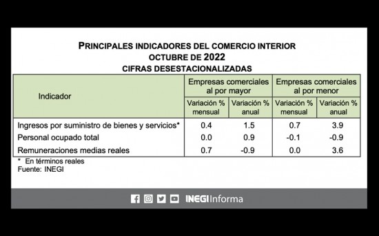 De acuerdo con el Instituto Nacional de Estadística y Geografía (Inegi), los ingresos reales por suministro de bienes y servicios de las empresas comerciales al por menor se ubicaron en 119.2 puntos, lo que representó un crecimiento de 0.7 por ciento en octubre, luego de que en septiembre se cayeron 0.2 por ciento, con cifras desestacionalizadas para hacer más comparable los periodos. En tanto, las ventas minoristas de empresas comerciales en México aceleraron su crecimiento durante el décimo mes del año con respecto al mismo mes de 2021, al subir 3.9 por ciento, tras el aumento de 3.4 por ciento interanual de septiembre. En medio de aumentos en los precios al consumidor en el país y de un ‘moderado’ crecimiento económico, los ingresos del comercio minorista superaron niveles antes de la pandemia, pues se registra un nuevo máximo histórico. En comparación con el nivel prepandemia, se tiene un avance de 2.3 por ciento. El personal ocupado en las ventas minoristas cayó 0.1 por ciento mensual y las remuneraciones pagadas se estancaron respecto a septiembre. En su comparación anual cayeron 0.9 por ciento el personal ocupado y las remuneraciones avanzaron 3.6 por ciento. En octubre, los ingresos reales de las empresas por suministro de bienes y servicios al por mayor aumentaron 0.4 por ciento en comparación con septiembre y subieron 1.5 por ciento anual. El personal ocupado aumentó 0.9 por ciento anual y las remuneraciones bajaron 0.9 por ciento anual, con cifras desestacionalizadas. Se activan los servicios En octubre de 2022 y con datos ajustados por estacionalidad, los resultados de la Encuesta Mensual de Servicios (EMS) indicaron que los ingresos totales reales por suministro de bienes y servicios, de los servicios privados no financieros aumentaron 0.5 por ciento a tasa mensual, luego de avanzar 0.1 por ciento en septiembre. En septiembre pasado y a tasa mensual, el personal ocupado total cayó 0.1 por ciento; los gastos totales por consumo de bienes y servicios, 0.8 por ciento y las remuneraciones totales reales disminuyeron 0.5 por ciento. En octubre de 2022, con cifras ajustadas por estacionalidad y a tasa anual, el índice agregado de los ingresos totales reales por suministro de bienes y servicios aumentó 9.4 por ciento; el de los gastos totales por consumo de bienes y servicios, 9.2 por ciento; el índice de las remuneraciones totales, 4.3 por ciento y el de personal ocupado total, 0.2 por ciento. |
