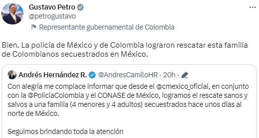 | El resultado del operativo fue reconocido por el presidente colombiano, Gustavo Petro Urrego: “bien. La policía de México y de Colombia lograron rescatar a esta familia de colombianos secuestrados en México. | ||||||