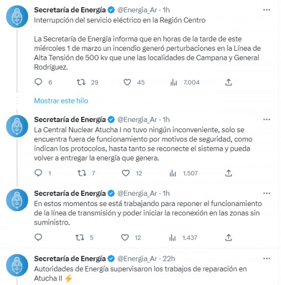 La falla provocó que salieran del servicio 10 mil megawatts de los 25 mil que se estaban generaron en ese momento, dijo una de las fuentes. La Secretaría de Energía informa que en horas de la tarde de este miércoles 1 de marzo un incendio generó perturbaciones en la Línea de Alta Tensión de 500 kilowatts que une las localidades de Campana y General Rodríguez (en la provincia de Buenos Aires), dijo la cartera en un comunicado. Ante el desbalance, el sistema responde en forma inmediata provocando la desconexión de la generación para su propia protección", explicó y agregó que se está trabajando para normalizar el servicio. El apagón se da en momentos de altas temperaturas en el verano austral, que se combina con una sequía histórica que llevó a la Bolsa de Cereales de Buenos Aires a reducir la semana pasada sus previsiones de cosecha para la soja y el maíz a 33.5 millones y 41 millones de toneladas, respectivamente. |