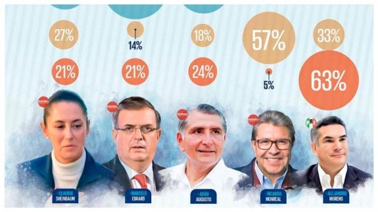 | Acapara medición Claudia Sheinbaum; le sigue Marcelo Ebrard; Adán Augusto López y Ricardo Monreal. De la oposición, los negativos los carga Alejandro Moreno | ||||||