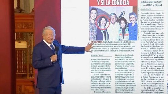 "Aquí lo que dicen es que yo mentí, que yo la conocía", dijo. Es hermana de Jorge Taddei Dijo que conoce bien a la familia de la funcionaria y que la persona señalada en la instantánea es la esposa de Jorge Taddei y no la ahora titular del INE. El mandatario aseguró que la titular del INE es hermana de Jorge Carlos Taddei Arriola, extitular de la Comisión Natural de Áreas Naturales Protegidas y padre de Pablo Daniel Taddei, director de Litio MX. "Este es el periodismo que están haciendo nuestros opositores de derecha", dijo sobre la publicación de esta información en medios de comunicación. |