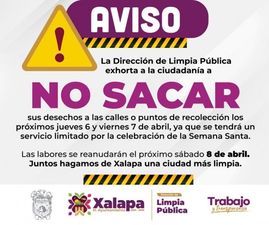 XALAPA.- Por la celebración de la Semana Santa y con el fin de cumplir con las Condiciones Generales de Trabajo que rigen a los empleados municipales, los días jueves 6 y viernes 7 de abril se limitará el servicio de recolección de desechos sólidos urbanos, por lo que se exhorta a la ciudadanía a no sacar sus residuos a las calles o puntos de recolección durante estos días, si no hay toque de campana.