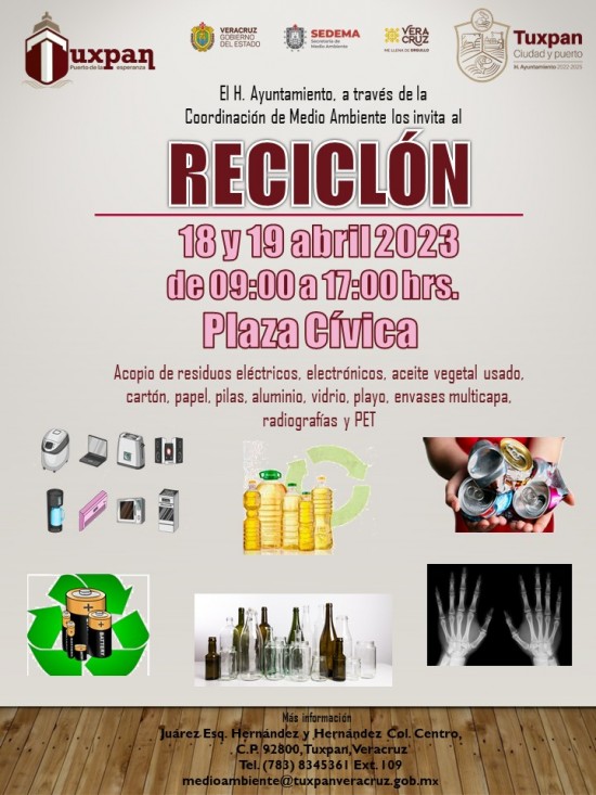 XALAPA.- El H. Ayuntamiento de Tuxpan que preside el Lic. José Manuel Pozos Castro, a través de la Coordinación de Medio Ambiente, invita a la ciudadanía a participar en el RECICLÓN 2023, que se llevará a cabo los próximos 18 y 19 de abril.