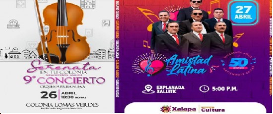 Las actividades organizadas por la Dirección de Cultura para esta semana, arrancan el lunes 24 de abril a las 17:00 horas en el Museo Casa de Xalapa (MUXA), con el Concierto Mateo Flecha “El Viejo” y el Género Novohispano de “Ensalada”, por parte del Ensamble de Música Antigua de Xalapa. El 25 de abril a las 18:00 horas, y como parte del programa “Movie martes”, se exhibirá en el Teatro J.J. Herrera la película “Gimme the power”, del director Olallo Rubio (México, 2012); y a la misma hora, pero en el Centro Recreativo Xalapeño (CRX), se presentará el libro “Personajes Xalapeños” del Club de Escritoras de Xalapa A.C. De igual manera y como parte de la gran inauguración del “Word Para Athletics Grand Prix Xalapa 2023”, ese día y a la misma hora, se presentarán la Marching Band Búhos de la Escuela Secundaria Industrial Nº 3, la Orquesta Municipal de Xalapa y los Performances de la canción “No voy a caer” por Kamila Bonetti, y por parte de la Compañía de Danza de la Universidad Anáhuac Xalapa. El 26 de abril se inaugurará en el CRX la exposición “Telar de Palabras”, del maestro René Ramírez Ordoñez, en el marco del Festival ESAV 2023, misma que contiene piezas de la indumentaria tradicional de los pueblos originarios mayas de Chiapas. Adicionalmente, la Orquesta Pauta Nueva se estará presentando a las 18:00 horas en la explanada de Lomas Verdes, segunda sección, en una edición más del programa “Serenata en tu colonia”. El 27 de abril a las 17:00 horas en la explanada de Xallitic se presentará la agrupación “Amistad Latina”, y a las 18:00 horas en la Casa Doña Falla Museo de la Música Veracruzana, se inaugurará el Encuentro de Poesía “Segundo Abril”, continuando a las 18:30 horas con el conversatorio sobre el oficio poético “Solo si canta es plenitud la boca”, y las 19:30 horas, con un recital poético. Este día, pero a las 19:00 horas en el Auditorio de la Iniciativa Municipal de Arte y Cultura (IMAC), la Banda Sinfónica del Gobierno del Estado de Veracruz, junto a los solistas Enrique Villegas y Raquel Contreras, ofrecerán el Concierto “Jazz, la era del Swing y las Big Bands”; y a la misma hora, en el CRX, se proyectará la película “Victoria”, dentro del Ciclo de Cine Alemán Contemporáneo. El 28 de abril a las 17:00 horas en la Casa Doña Falla, Carlos Romano, Manuel Vásquez y Norma Yolanda López llevarán a cabo el evento “Palabras que Danzan”, textos, ideas y remembranzas”; a las 18:30 horas en el CRX, los alumnos del maestro Manrique y la maestra Diana Enrique deleitarán a los asistentes con un Concierto de Música Popular; y a las 21:00 horas en el parque Benito Juárez, se realizará una edición más de los “Viernes de Punchis Punchis”, con un Live Set de Techno y la participación de Danny Mora y Ogma. Continuando con las actividades de “Segundo Abril”, este día de 10:00 a 12:00 y 13:00 horas, respectivamente, se impartirán los talleres de poesía para adolescentes y de poesía teórico práctico; seguido, de 12:00 a 13:30 horas y de 13:00 a 14:00 horas de los conversatorios: “Todas las ballenas” y “Entre el conocimiento y la imaginación: charla sobre filosofía y poesía”. También, de 17:00 a 18:00 horas será el turno de la plática “Cotilleos y humildes opiniones sobre poesía: conversatorio y lectura”; y por último, de 18:30 a 19:30 horas, el conversatorio y recital poético “Concierto a tres voces”. El sábado 29 de abril seguirán los conversatorios “Editar y publicar poesía”, de 10:30 a 11:30 horas; “Poesía no eres tú”, de 12:00 a 13:00 horas, y “Revisitar a los clásicos; sobre traducir poesía”, de 17:00 a 18:00 horas; la presentación de los libros: “Péndulo y Sextante” de Adán Brand a las 13:00 horas, y “Cuadernos de Patología Humana”, de Orlando Mondragón, a las 16:00 horas; finalmente la Gala Poética a las 18:30 horas y la clausura a las 19:30 horas. Asimismo, los días 28 y 29 de abril de 10:00 a 19:00 horas, la Regiduría Quinta y Mujeres Mágicas llevarán a cabo la “Expo Niñez Mágica”, en el CRX. Este último día, a las 17:00 horas en el Museo de la Música Veracruzana, el Grupo Escénico Malacatonche presentará “El traje nuevo del rey”; a las 18:00 horas en el Auditorio de la IMAC, la Orquesta Filarmónica de Xalapa ofrecerá el concierto “Había una vez... una orquesta”; también a esa hora, en el CRX, se presentará el libro “Poesía para descubrir las letras”, de María Haydé Zamora García”; y a las 19:00 horas en el Teatro J.J. Herrera, se presentará la única función de “Tonta”, texto y dirección de Adrián Vázquez con Arlet Gamino. Para festejar a la niñez capitalina, el 30 de abril a las 12:00 horas en el Teatro J.J. Herrera, la Escuela Superior de Artes de Veracruz (ESAV) junto con el Ayuntamiento ofrecerán la Función de Gala del Ballet Folklórico Infantil; mientras que desde esa hora, en el parque Benito Juárez dará inicio al programa especial para celebrar a los pequeños de la casa, contando con talleres, música, danzón, lotería mexicana, show de payasitos, fomento a la lectura, actividades musicales, coreografías y bailes con botargas; además del show de Encanto. Entre tanto, la Dirección de Actividades Artísticas de la Secretaría de Educación de Veracruz (SEV), festejará el Día Internacional del Jazz con conferencias, mesa redonda y presentaciones musicales, desde las 10:00 horas en la Casa Doña Falla; y a las 16:00 horas en el Auditorio de la IMAC, la Fundación Lepach presentará el Espectáculo con Causa “Amima-2”. Más información y detalles de todos los eventos se pueden consultar en la página de Facebook Cultura Xalapa. |