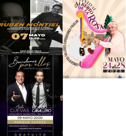 Como parte del Circuito de Exhibición Documental Ambulante, el martes 2 de mayo se tendrá la proyección de “Dear Future Children”, dirigido por Franz Böhm, a las 19:00 horas, en el Teatro J.J. Herrera. La entrada es libre y el cupo limitado; además, a las 18:00 horas se realizará la inauguración del Festival “Xalapa Baila Tap”, en el Centro Recreativo Xalapeño (CRX). El miércoles 3 de mayo, a las 18:00 horas, se hará la presentación del libro “Encuentros y Murmullos”, en el CRX, con entrada libre; a la misma hora en el Teatro J.J. Herrera se proyectará el documental “Comala”, de Gian Cassini, mientras que el jueves 4, a las 19:00 horas, se presentará “Danzadicción”, por parte de Aidanza Estudio de Danza Árabe en el Teatro J.J. Herrera. Del 5 hasta el 14 de mayo, se llevará a cabo el X Festival Nacional de Teatro con Niños “¡Chicos y chicas a escena!”. Las actividades inician el viernes en el Foro Guadalupe Balderas del CRX, a las 17:00 horas, con el conversatorio: Literateatro y su formación actoral con niños, aprendizaje integral más allá de la teatralidad. Para el 6 de mayo a las 19:00 horas regresa al emblemático barrio de Xallitic la Orquesta Sinfónica de Xalapa (OSX). A la misma hora, en el Teatro J.J. Herrera, se presentará “Hijos del Sol”, de la compañía Artefacto Danza-FILU, y a las 16:00 horas se realizará un Recital Infantil de la Academia Suzuki Stars, en el Museo de la Música Veracruzana “Casa Doña Falla”, con entrada libre. El 7 de mayo a las 16:00 horas, se presentará “Una Bohemia a las madres” con Messe Merari, Duetos Mela’o y 2ke 3, mientras que en el Museo de Antropología de Xalapa se podrá disfrutar del “Ensamble Son la Semilla, Música y Danza del Sotavento”, del director Raúl Monge, a las 12:00 horas, y como parte de los Domingos Familiares, se contará con el Ballet Folklórico Atzin de la Escuela “Enrique C. Rébsamen”. El 8 de mayo, como parte del programa de Conciertos Didácticos, en el Auditorio de la Benemérita Escuela Normal Veracruzana (BENV) “Enrique C. Rébsamen”, se presentará la Orquesta Municipal de Xalapa a las 11:30 horas; mientras que a las 19:00 horas se podrá disfrutar de “Con Amor para Mamá”, de Hermandad Xalapeña, en el Auditorio de la Iniciativa Municipal de Arte y Cultura (IMAC); a las 17:00 horas en el Teatro J.J. Herrera se realizará “Nosotras, los otros y les otres”, por parte del Teatro Comunitaria para Juventudes, a las 17:00 horas. Asimismo, este 8, 15, 22 y 29 de mayo se tendrá la Reunión de Cuentistas en el CRX con entrada libre. Para el 9 de mayo está programado el Concierto a las Madres “Brindemos por ellas”, con Carlos Cuevas, Ricardo Caballero y la Orquesta Municipal de Xalapa, a las 20:00 horas, en el parque Benito Juárez. El programa musical iniciará desde las 17:00 horas con la Orquesta Pauta Nueva, la voz gemela de José José, el Doble de Leo Dan y más actividades. Del 24 al 28 de mayo se llevará a cabo el Festival “Alberto de la Rosa”, que incluye un Concierto de Arpa de los alumnos del maestro Alberto de la Rosa. Este evento con entrada libre se realizará en el Teatro J.J. Herrera a las 19:00 horas; también se llevará a cabo el 25 y 27 de mayo a la misma hora. Más información y detalles de todos los eventos se pueden consultar en la página de Facebook Cultura Xalapa. |