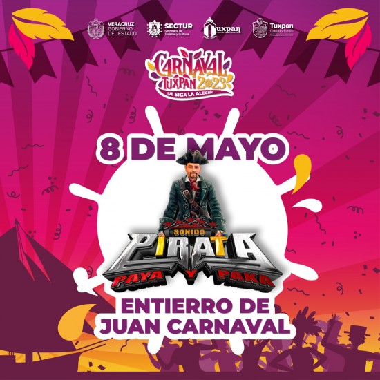 Este lunes 8 de mayo, en el Entierro de Juan Carnaval, se presenta Sonido Pirata. La cita es en el Estadio de la Unidad Deportiva, a partir de las 21:00 horas.