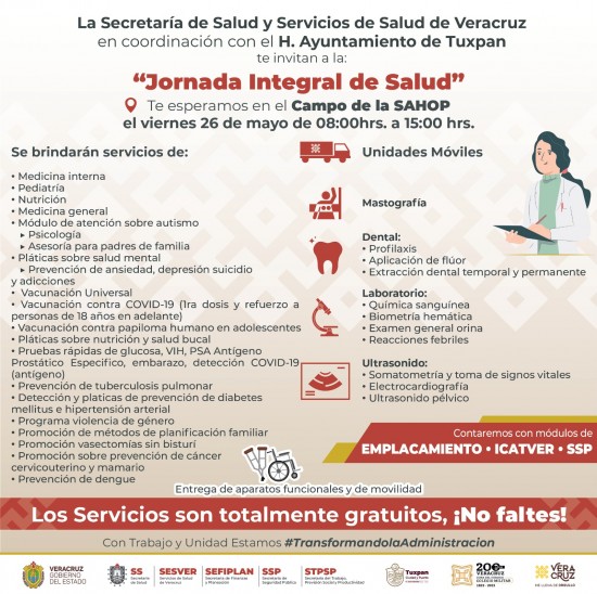 La Secretaría de Salud y Servicios de Salud de Veracruz, en coordinación con el H. Ayuntamiento de Tuxpan, invitan a la ciudadanía a la “Jornada Integral de Salud” que se llevará a cabo el próximo viernes 26 de mayo, de 8:00 a 15:00 horas, en el Campo de la SAHOP. Esta jornada tiene como propósito apoyar a la población en situación vulnerable, al brindar de manera gratuita consultas médicas de diversas especialidades, y realizar estudios de mastografía, dentales, laboratorio y ultrasonidos. Se instalará un módulo de atención sobre autismo que incluye atención psicológica y asesoría para padres de familia; y se realizarán programas de violencia de género, salud reproductiva, prevención de enfermedades, nutrición y salud mental. También se aplicará vacunación universal, así como contra COVID-19 a mayores de 18 años, papiloma humano a adolescentes; y se practicarán pruebas rápidas de glucosa, VIH, PSA Antígeno Prostático Específico, embarazo y detección de COVID-19. Se entregarán aparatos funcionales y de movilidad, y además se contará con módulos de emplacamiento, servicios de ICATVER y SSP. Con esta jornada se intensifican las acciones de prevención y cuidado de la salud entre la población. |