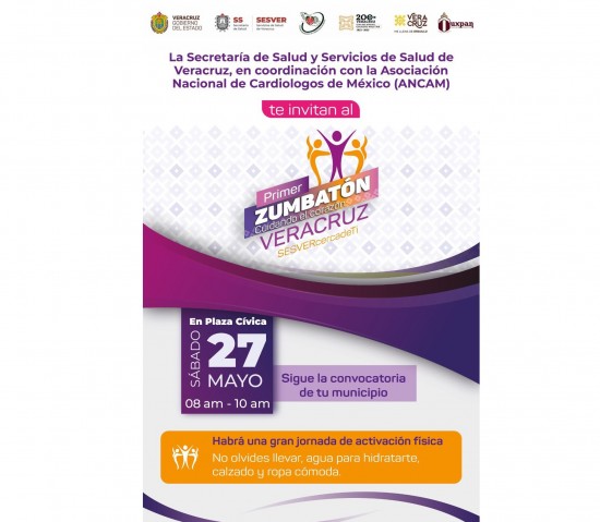 Tuxpan, Ver.- El Gobierno Municipal y el DIF Tuxpan invitan a la población a participar en el “Primer Zumbatón, cuidando el corazón”, que realizan la Secretaría de Salud y Servicios de Salud de Veracruz en coordinación con la Asociación Nacional de Cardiólogos de México (ANCAM).