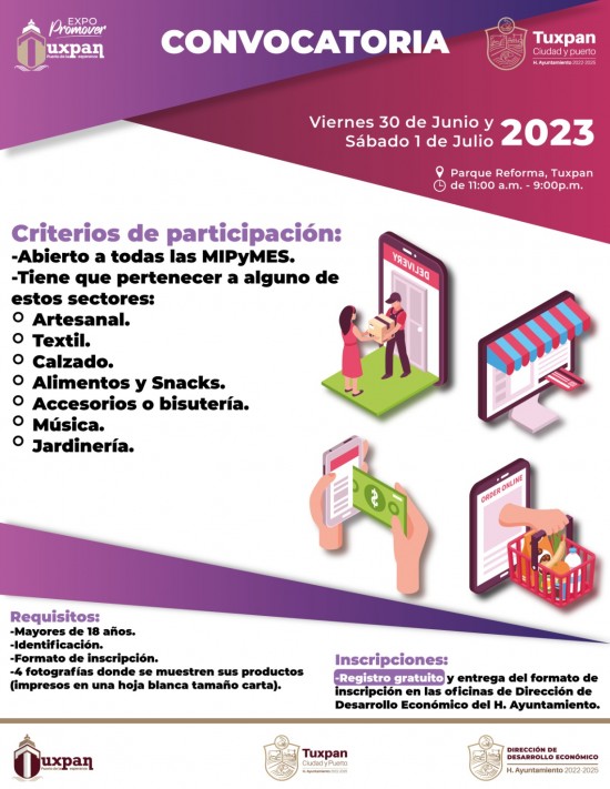 El Gobierno de Tuxpan, a través de la Dirección de Desarrollo Económico, lanzó la convocatoria para participar en la Tercera Edición de la “Expo-Venta Promover Tuxpan 2023”. Esta convocatoria está dirigida a todas las micro, pequeñas y medianas empresas (MIPYMES) y emprendedores del municipio que pertenezcan al sector artesanal, textil, calzado, alimentos y snacks, accesorios o bisutería, música y jardinería. El evento se desarrollará el viernes 30 de junio y sábado 1° de julio, de 11:00 de la mañana a 9:00 de la noche, en el Parque Reforma. Los requisitos para el registro son los siguientes: Ser mayor de 18 años, presentar identificación vigente y 4 fotografías de los productos (impresos en hoja blanca tamaño carta), y llenar el formato de inscripción. La inscripción es completamente gratuita y se realiza en las oficinas de la Dirección de Desarrollo Económico, ubicadas en la planta alta de la Presidencia Municipal, en horario de 9:00 a 15:00 horas. Participa y forma parte de este proyecto que dará un gran impulso a tu negocio. |