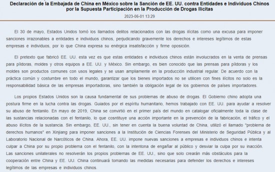 Las sanciones apuntan a la empresa mexicana Mexpacking Solutions, con sede en Chihuahua y controlada por el cártel de Sinaloa, y a tres personas: Mario Ernesto Martínez Trevizo, Cinthia Adriana Rodríguez Aleida y Ernesto Alonso Macías Trevizo, así como a entidades y personas en China. La representación diplomática del gobierno de Xi Jingpin acusó a las autoridades estadounidenses de “engañar al público”, de “desviar la culpa” del problema del consumo de drogas a China y de “imponer sanciones irrazonables”. “El pretexto que fabricó EU esta vez es que estas entidades e individuos chinos están involucrados en la venta de prensas para píldoras, moldes y otros equipos a EU y México. Sin embargo, es bien conocido que las prensas para píldoras y moldes son productos comunes con usos legales y se usan ampliamente en la producción industrial regular”, expresó la embajada china. Agregó que “de acuerdo con la práctica común y costumbre en todo el mundo, garantizar que los bienes importados no se utilicen con fines ilícitos no solo es la responsabilidad básica de las empresas importadoras, sino también la obligación legal de los países importadores”. La oficina a cargo del embajador Zhang Run aseguró que su país “continuará tomando las medidas necesarias para defender los derechos e intereses legítimos de las empresas e individuos chinos”. Aseguró que China espera que las autoridades mexicanas le proporcionen pronto los resultados finales de los análisis de laboratorio que se realizan a mercancías provenientes de China e incautadas en un puerto mexicano, y que el gobierno mexicano ha señalado que se trata de fentanilo. El gobierno chino dijo que una vez confirmada la naturaleza de las sustancias detectadas, se realizará “el trabajo de seguimiento” en el caso, en el cual, afirmó, “los departamentos competentes de ambos países mantienen buenas comunicaciones y están llevando a cabo una cooperación excelente y profesional”. “China concede suma importancia a su cooperación antidroga con México y son bien fluidos los canales de la cooperación bilateral”, aseguró. |