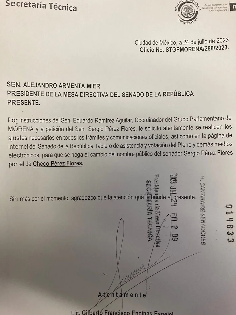 Parte de la bancada morenista en la Cámara de Senadores y con aspiraciones a la gubernatura de Morelos, el senador solicitó a la mesa directiva reajustar el nombre con el que aparece en las diversas plataformas gubernamentales como el tablero de asistencias, votación, medios electrónicos y por supuesto, trámites oficiales. Mediante un oficio con folio STGPMORENA/288/2023 fechado al 24 de julio, el secretario técnico de Morena Gilberto Encina Espejel pidió al presidente de la Cámara, Alejandro Armenta, realizar el cambio. La petición únicamente se limita a ello y no expone argumento alguno sobre el porqué de la situación. Pese a que ambos trámites se encuentran en proceso, el legislador morelense ya hace uso de logotipo Checo Pérez Flores en sus diversas publicaciones en las que hace promoción de sus actividades, así como de su cercanía con otros morenista como Citlalli Hernández, Mario Delgado o el propio presidente Andrés Manuel López Obrador (AMLO). Es senador por principio de mayoría relativa desde febrero de 2021 y forma parte de ocho comisiones: dos como secretario (Relaciones Exteriores Europa y Organismos Internacionales), y seis como integrante (Comunicaciones y Transporte, Defensa Nacional, Desarrollo y Bienestar Social, Desarrollo Urbano, Seguridad Social y Minería y Desarrollo Regional). Entre su trayectoria curricular, destaca una licenciatura en Informática y dos Maestrías, la primera en Ciencia Políticas y Sociales y la segunda en Administración Pública. Como funcionario ha trabajado en la Secretaría del Bienestar y ocupar varios cargos locales en su natal Morelos. ![]() En 2022, Pérez Flores protagonizó una polémica luego de despedir a su secretaria particular y jefa de oficina. La trabajadora acusó que el motivo de sus despido fue su condición de embarazo, por lo que presentó una querella legal que finalmente proliferó a su favor. Buscar registrar la marca El morenista lleva a cabo el trámite correspondiente para poder hacer de su nombre una marca registrada ante el IMPI. El objetivo, según el expediente, es la organización de exposiciones, conferencias, congresos y simposios con fines culturales o educativos. De acuerdo con el documento con número 2905358, la solicitud fue impulsada desde marzo del año en curso, el representante legal es Carlos Alberto Martínez y se trata de un procedimiento por el que se pagó poco menos de 3 mil pesos. La resolución del instituto aún se encuentra pendiente. |