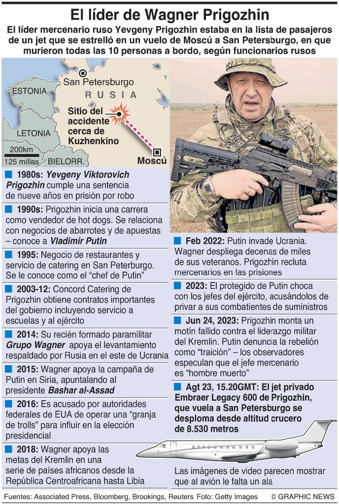 Prigozhin era "un hombre con un destino complicado, que cometió graves errores en su vida, pero que obtenía los resultados que se proponía", afirmó Putin en una reunión transmitida por televisión, en la cual presentó su pésame a los familiares de las víctimas del siniestro aéreo. En el avión viajaban diez personas, que según las autoridades del sector aéreo ruso murieron. Entre las víctimas figuran otros responsables de Wagner, incluyendo el principal Dmitri Utkin, principal colaborador de Prigozhin, de acuerdo con la misma fuente. "Se trata de personas que hicieron aportes significativos a nuestro esfuerzo conjunto" en Ucrania, dijo Putin, en referencia a la ofensiva militar que Rusia lanzó en la exrepública soviética en febrero de 2022. Prigozhin lideró en junio un breve motín de sus milicianos contra el Estado Mayor ruso, lo que llevó a Putin a tildarlo de "traidor". El mandatario ruso prometió una investigación "a fondo" de las causas de la caída del avión, que generó numerosas conjeturas sobre un posible asesinato de quien había pasado de aliado a principal enemigo del Kremlin. "Veremos lo que dirán los investigadores en un futuro cercano. La pericia se está realizando, una pericia técnica y genética. llevará un tiempo", comentó. ![]() El líder mercenario ruso Yevgeny Prigozhin estaba en la lista de pasajeros de un jet que se estrelló en un vuelo de Moscú a San Petersburgo, en que murieron todas las 10 personas a bordo, según funcionarios rusos. Vía Graphic News. |