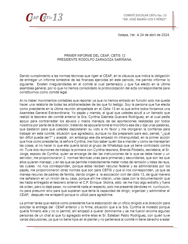 De acuerdo a las normas técnicas que rigen al Comité, legalmente constituido como Asociación Civil, al no haber sido convocada por su presidente, la Asamblea no podía llevarse a cabo, sin embargo se realizó y fue hecha en la vía pública con los riesgos que conlleva, en una afán de Guevara y Filobello por victimizarse, pues la autorización para la utilización de las instalaciones escolares se dio en tiempo y forma. A través de un documento fechado el 24 de abril y distribuido este lunes a los padres de familia, Zaragoza Sariñana explica que el comité al que pertenece nunca fue protocolizado ante notario público, como corresponde legalmente, en su lugar, la tesorera y la secretaria realizaron un acta ante el notario Emeterio López Márquez, en la que el presidente Rodolfo Zaragoza no está incluido, lo que evidencia dolo en su actuar. En el documento de referencia, Zaragoza explica que luego de varias reuniones con ambas personas, buscaban presionarlo y relata que “recibí instrucciones de lo que tenía qué hacer y cómo debía manejar las cosas, me leyeron los compromisos que habían adquirido con el grupo de papás que las apoyaron, enlistaron las promesas y las prioridades”: “La cabeza de la directora Dalia (Pérez) este era el principal objetivo según dijeron”. “Tomar el mando y la administración del CEAP, obvio con sus recursos económicos”. “Quitar los programas de viajes de alumnos a eventos deportivos y culturales”. “Exigir las becas, que faltaron”. “Convertir el CEAP de CBTIS en un CEAP de secundaria, ¿por qué? Por qué quieren cambiar las normas técnicas para rigen al comité”. Debe destacarse que “en ningún punto me dijeron que la finalidad era mejorar las condiciones del plantel para el aprovechamiento óptimo de nuestros hijos”. De forma adicional a este documento, existen grabaciones en audio y video, así como capturas de pantalla de distintos chats en los que se evidencian los verdaderos intereses que mueven a las señoras Cinthya Gabriela Guevara y Brenda Filobello. Rodolfo Zaragoza Sariñana explica que “con esta gente sólo puedo trabajar si estoy dispuesto a participar en tranzas (sic), y no lo voy a hacer” y exhorta ahí mismo a que se nombre otro CEAP “que no esté contaminado”, en el que nadie sea ratificado, sino gente nueva con ganas de trabajar por los alumnos y por el plantel. ![]() ![]() ![]() ![]() ![]() |