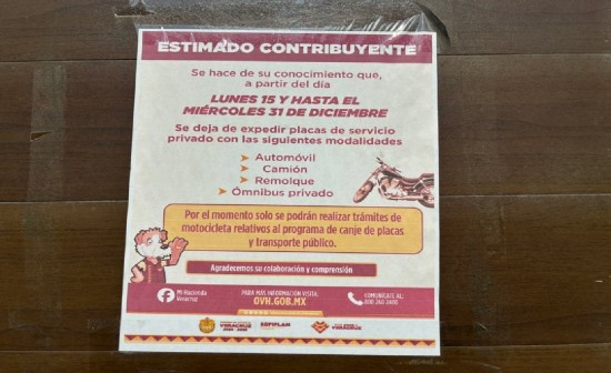 XALAPA.- Vaya caso, los ciudadanos que acuden a realizar el trámite del emplacamiento de automóviles en Veracruz se han encontrado con un anuncio en las Oficinas de Hacienda del Estado, en el cual se informa que los únicos trámites que estarán realizando serán el reemplacamiento o canje de motos. Así las cosas, del 17 al 31 de diciembre, las oficinas de Hacienda solo realizarán el canje de placas para motocicletas y trámites de transporte público. Este anunció indica que, “por el momento solo se podrán realizar trámites de motocicleta relativos al programa de canje de placas y transporte púbico”. De acuerdo con este anunció desde este miércoles 17 hasta el 31 de diciembre en las oficinas de Hacienda del Estado no se realizarán los siguientes trámites de expedición de placas para el servicio privado de las modalidades: Automóvil, Camión, Remolque y Ómnibus privado. Este es el aviso colocado para los conductores en las oficinas de Hacienda del Estado. Señalaron que solo se están realizando los trámites de canje de placas para motocicletas y de transporte público. Por lo anterior, solicitaron la comprensión de los conductores para respetar cuáles son los trámites que hasta el momento se encuentran realizando en las oficinas de Hacienda del Estado que se ubican en la avenida Benito Juárez en el Centro de Veracruz. Cabe recordar que a partir del 1 de enero de 2026 se reanudarán los servicios, por lo que se espera que los conductores de las diversas modalidades de servicio privado puedan realizarlos una vez finalizado el canje de placas de motocicletas.